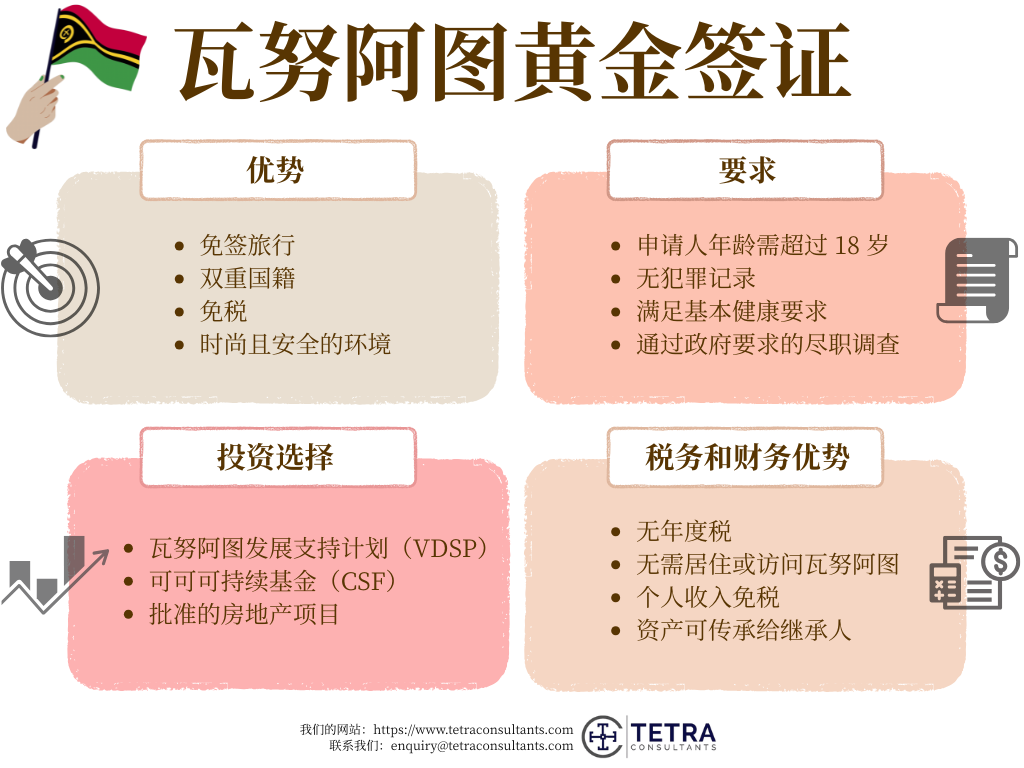 - 现在,您可以通过瓦努阿图黄金签证计划快速且经济地获得第二国籍。这种签证的办理时间很快,没有居住要求,可以免签证进入110多个国家。这种投资入籍(CBI)途径为高净值个人和全球企业家提供了理想的解决方案,导致越来越多的企业主选择在瓦努阿图注册公司。特加商务咨询顾问将引导您完成瓦努阿图公民投资的每个阶段,确保无缝和100%的远程申请流程。