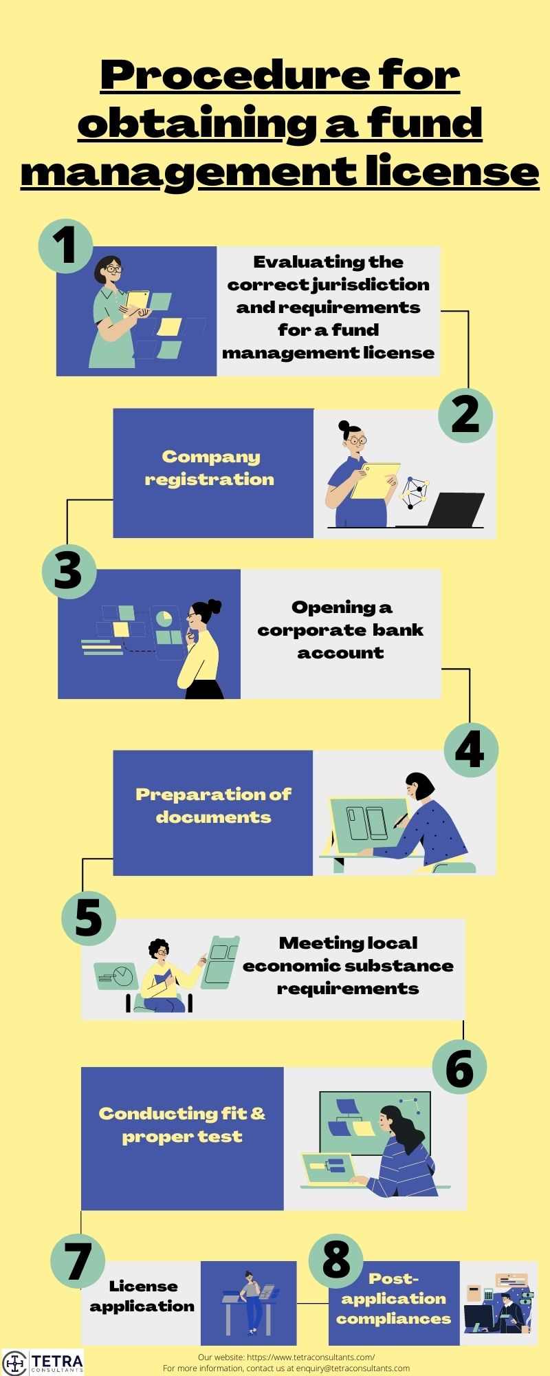 For obtaining a fund management license different nations will have different stages, regulations, and processes. Tetra Consultants has consolidated the more prevalent steps involved in obtaining a fund management license in a normal engagement.