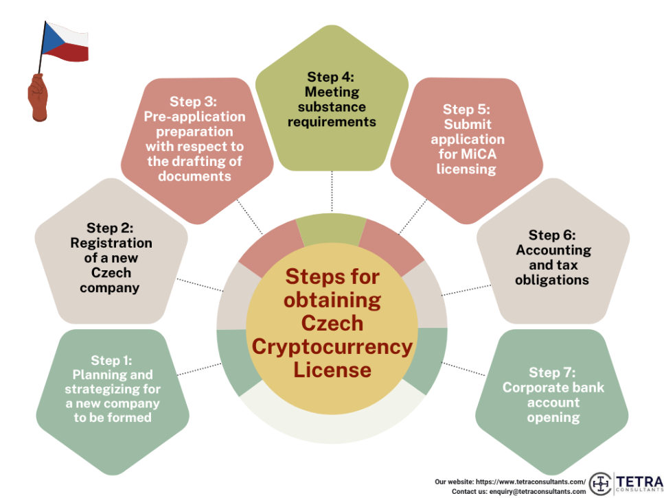 - Tetra Consultants’ team of licensing experts will thoroughly guide you on how to apply for a crypto license in the Czech Republic, what these requirements are, and what they entail. In the section below, our team has outlined the most prevalent steps that take place during the course of applying for a Czech crypto license.