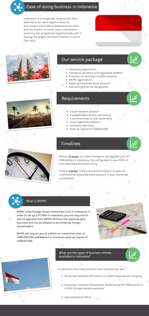 - Tetra Consultants will be your one-stop solution for Indonesia company registration. Our services include company formation, registered agent, registered address and business bank account opening.