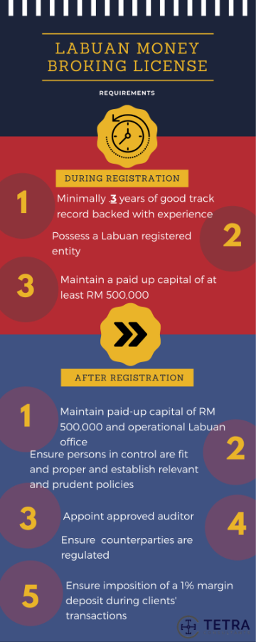- Once above is completed, Labuan FSA will issue you the full Labuan money broking license. In total, Tetra Consultants expects to register your Labuan company, open Labuan corporate bank account and secure Labuan money broking license within 4 to 5 months.
