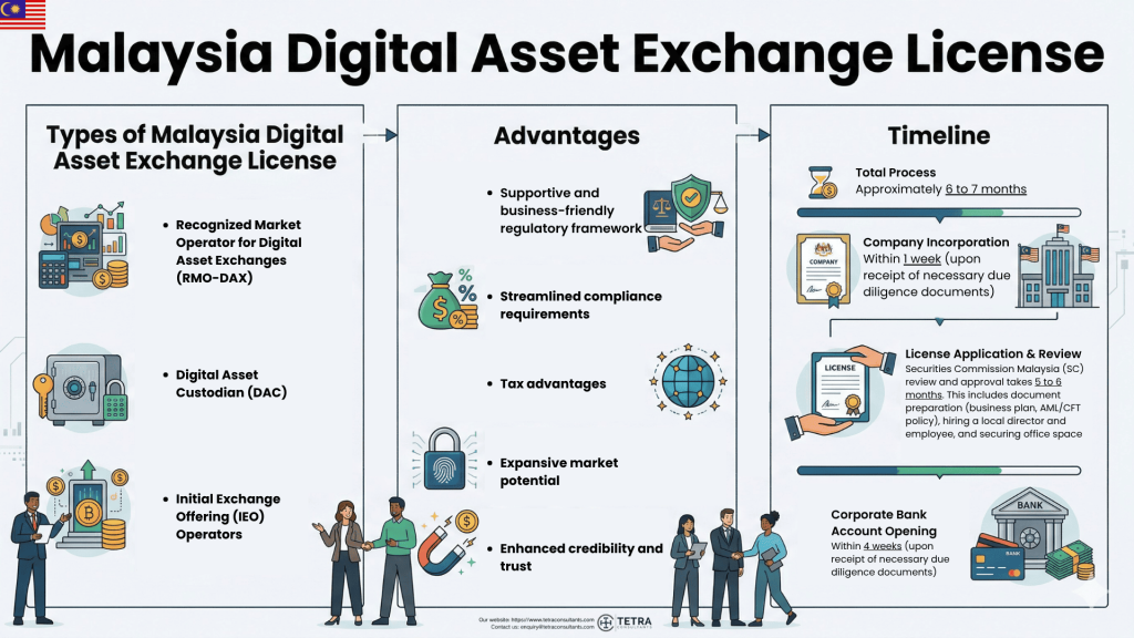 - At Tetra Consultants, our team of lawyers, licensing specialists, compliance professionals, and accountants will assist you in seamlessly obtaining a Malaysia Digital Asset Exchange License in 2026. We provide end-to-end support including Malaysia company incorporation, preparation and submission of the Recognized Market Operator –Digital Asset Exchange (RMO-DAX) license application, regulatory compliance advisory, and post-licensing operational support, ensuring your business meets all requirements set by the Securities Commission Malaysia.