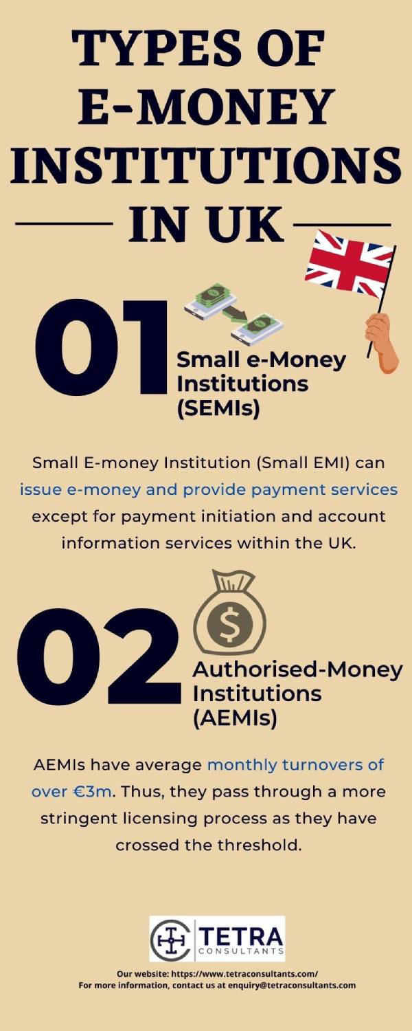 • Small E-money Institution (Small EMI) can issue e-money and provide payment services except for payment initiation and account information services within the UK.